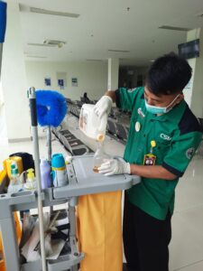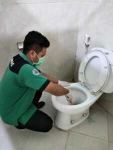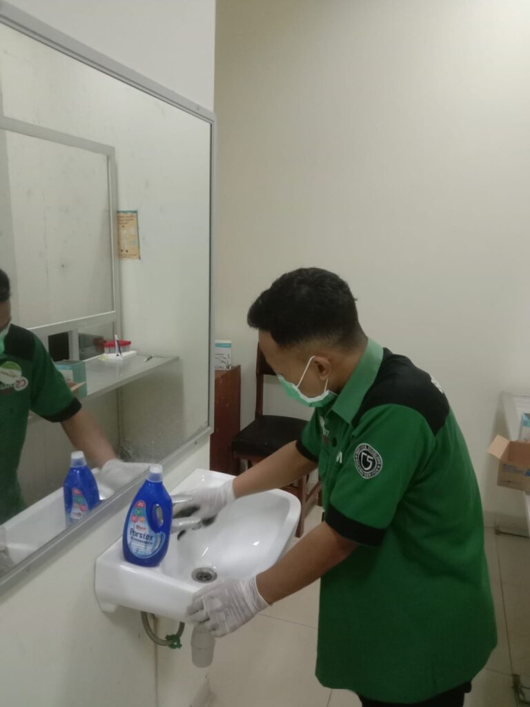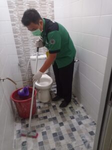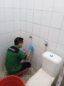 Penyemprotan disinfektan untuk perlindungan ekstra guna menjamin kebersihan kamar mandi. Ulangi setidaknya dua kali seminggu. Semprotkan pada setiap permukaan alat di kamar mandi.